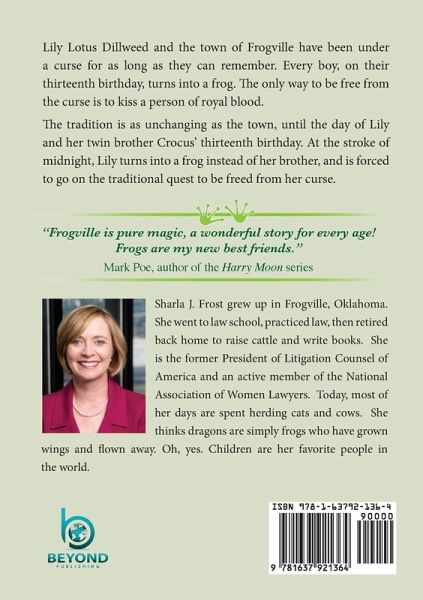 Lily Lotus Dillweed and the town of Frogville have been under a curse for as long as they can remember. Every boy, on their thirteenth birthday, turns into a frog. The only way to be free from the curse is to kiss a person of royal blood. The tradition is as unchanging as the town, until the day of Lily and her twin brother Crucus' thirteenth birthday. At the stroke of midnight, Lily turns into a frog instead of her brother, and is forced to go on the traditional quest to be freed from her curse. "Frogville is pure magic, a wonderful story for every age! Frogs are my new best friends." Crystal Dwyer Hansen, NYT Bestselling ASK!
