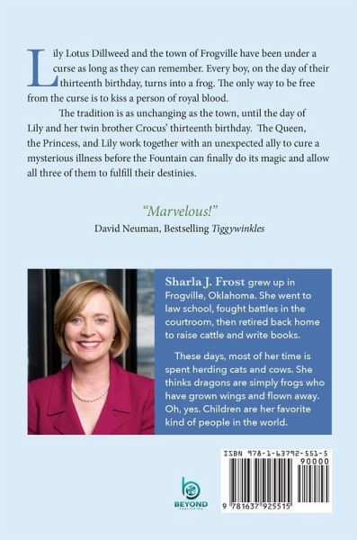 Lily Lotus Dillweed and the town of Frogville have been under a curse as long as they can remember. Every boy, on the day of their thirteenth birthday, turns into a frog. The only way to be free from the curse is to kiss a person of royal blood. The tradition is as unchanging as the town, until the day of Lily and her twin brother Crocus' thirteenth birthday. The Queen, the Princess, and Lily work together with an unexpected ally to cure a mysterious illness before the Fountain can finally do its magic and allow all three of them to fulfill their destinies. "Marvelous!" David Neuman, Bestselling Tiggywinkles