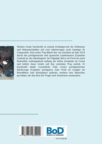 Markus Frank beschreibt in seinem Erstlingswerk die Erlebnisse und Bekanntschaften auf zwei Jakobswegen nach Santiago de Compostela. Sein erster Weg führte ihn von Lissabon im Jahr 2018 durch das portugiesische und spanische Landesinnere (Caminho Central) an das Jakobusgrab. Im Folgejahr lief er ab Porto bis nach Redondela weitestgehend entlang der Küste (Caminho da Costa) und kehrte dann wieder auf den zentralen Weg zurück. Er beschreibt damit wesentliche Teile zweier portugiesischer Jakobswege (Caminho portugues). Sein Werk ist weniger als Reiseführer und Reiseplaner gedacht, sondern den Menschen gewidmet, die den Reiz des Weges und Abenteuers ausmachen.