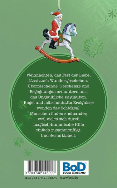 Weihnachten, das Fest der Liebe, lässt auch Wunder geschehen. Überraschende Geschenke und Begegnungen ermuntern uns, das Unglaubliche zu glauben. Engel und märchenhafte Ereignisse wenden das Schicksal. Menschen finden zueinander, weil vieles sich durch magisch-himmlische Hilfe einfach zusammenfügt. Und Jesus lächelt.