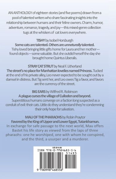FROM A CAT'S VIEW is a novel-length collection of short stories that will tug at the whiskers of cat lovers everywhere. This unique anthology is drawn from a pool of exceptional writers in the US, UK, and Canada, who share fascinating insights into the relationship between humans and their feline owners: TWO HOURS, a poem of freedom re-envisioned THE CEMETERY CAT - There was a cat for each grave--three-hundred forty-seven in all--and one had unfinished business. SPECIAL - Family is ... well, family. Maxie is special, and only Aunt 'Po can lift him from the gutter to the good life. TISHY - Some cats are talented. Others are unnaturally talented. Tishy outdid herself the day she brought home Quintus Liberalis. INTREPIDUS - It wasn't the first time he'd made her feel alone and unloved. The breach between cat and human can be insurmountable, and the need to strike out from the pain of unrequited love, impossible to ignore. WITCH CAT - Her kind are on the way out, but Old Gert isn't one to go quietly. She knew just what to do: Cheat! "Here kitty, kitty." MOONLIGHT, a poem on notions of contentment MAU OF THE PHARAOHS - Favored by the living God, Tutankhamun, Mau, in exchange for safe passage to the next world, offers Bastet his life story as viewed from the laps of three pharaohs. BIG EARS - A plague curses the village of Culloden and beyond. Little do the superstitious humans understand they've condemned their only chance for salvation. NICE WORK IF YOU CAN GET IT - Freedom is only as good as the next pilfered salmon fillet. Atticus prospered, now it was time to level up to fulfillment. THE OPEN ROAD - Most shun the solitary life; a few seek it. Quicksilver, ship's cat by profession, was in the latter group. MULGRAVE'S RESOLVE - Endurance, boredom, hunger, anger, reward: Mr. Mulgrave conquered the milestones on the road to survival one at a time, alone. But for the last mile, he'll need providence at his side. A CAT'S CONFESSION, a poem and bid for absolution THE CAT'S APPRENTICE - Change is bad; being ignored is unacceptable. No one was putting Malcolm in a corner--certainly not this interloper-wizard-wannabe. STRAY CAT STRUT - The street's no place for Manhattan lovelies with names like Princess. Leo never expected to be sought out by a damsel in distress. But Tig sent her, and Leo owes Tig a favor. SAVANNAH AND SAVANNAH - If you find a lost cat with your name on its collar it's fate ... right? Meant to be. But what if it really is meant to be? Think about it ... think twice about it. THE REAL THING - Locked in a vending machine, Leon's stomach rumbled. He could hear his little girl calling him home. THIRD EYE LIVING - All cats have nine lives; only the bravest have three eyes. When Mr. Fluffers' mother warned him about fairies, she failed to mention their pointy spears, sharp teeth, and evil grins. CAT'S SCHRÖDINGER, a poem from inside the box. THE STRAY - I kill to eat, and to feed the big pink one that cannot hunt. There are fences, and barbwire, and smoke that burns the eyes and throat. TIN OPENER - Justice arrives on the heels of the reaper. When Jasper's tin opener is killed, he uses his knowledge of the occult to summon help. CATS ARE PATIENT - Six thousand years of plotting threatened by one, weak human. Not once, in the long history of the Ailurian, had they found it necessary to dispose of a human ... until now. LONGING, a poem of simple desires. FROM A CAT'S VIEW, the purrrfect gift for cat lovers everywhere.