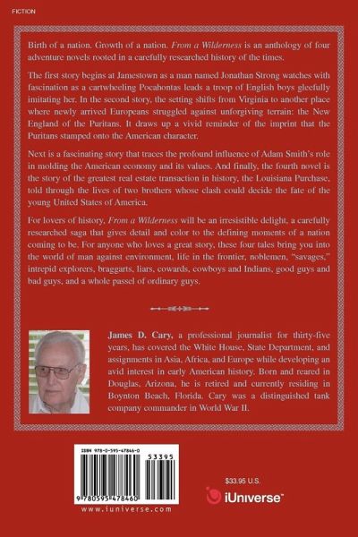 Birth of a nation. Growth of a nation. From a Wilderness is an anthology of four adventure novels rooted in a carefully researched history of the times. The first story begins at Jamestown as a man named Jonathan Strong watches with fascination as a cartwheeling Pocahontas leads a troop of English boys gleefully imitating her. In the second story, the setting shifts from Virginia to another place where newly arrived Europeans struggled against unforgiving terrain: the New England of the Puritans. It draws up a vivid reminder of the imprint that the Puritans stamped onto the American character. Next is an unexpectedly fascinating story that traces the profound influence of Adam Smith's role in molding the American economy and its values. And finally, the fourth novel is the story of the greatest real estate transaction in history, the Louisiana Purchase, told through the lives of two brothers whose clash could decide the fate of the young United States of America. For lovers of history, From a Wilderness will be an irresistible delight, a carefully researched saga that gives detail and color to the defining moments of a nation coming to be. For anyone who loves a great story, these four tales bring you into the world of man against environment, life in the frontier, noblemen, "savages," intrepid explorers, braggarts, liars, cowards, cowboys and Indians, good guys and bad guys, and a whole passel of ordinary guys.