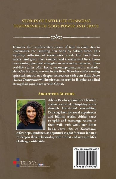 STORIES OF FAITH: LIFE-CHANGING TESTIMONIES OF GOD'S POWER AND GRACE Discover the transformative power of faith in From Acts to Testimonies, the inspiring new book by Adrian Read. This uplifting collection of testimonies reveals how God's love, mercy, and grace have touched and transformed lives. From overcoming personal struggles to witnessing miracles, these real-life stories offer hope, encouragement, and a reminder that God is always at work in our lives. Whether you're seeking spiritual renewal or a deeper connection with your faith, From Acts to Testimonies will inspire you to trust in His plan and find strength in your journey with Christ.