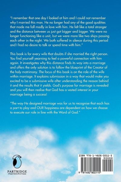 "I remember that one day I looked at him and I could not remember why I married this man. He no longer had any of the good qualities that made me fall madly in love with him. He felt like a total stranger and the distance between us just got bigger and bigger. We were no longer functioning like a unit, but we were more like two ships passing each other in the night. We both suffered in silence during this period and I had no desire to talk or spend time with him." This book is for every wife that doubts if she married the right person. You find yourself yearning to feel a powerful connection with him again. It investigates why this distance finds its way into a marriage and offers the only solution is to follow the blueprint of the Creator of the holy matrimony. The focus of this book is on the role of the wife within marriage. It explains submission in a way that would make you excited to be a submissive wife after understanding the reason behind it and the results that it yields. God's purpose for marriage is revealed and you will then realise that God has a vested interest in your marriage being a success! "The way He designed marriage was for us to recognise that each has a part to play and OUR happiness are dependent on how we choose to execute our role in line with the Word of God."