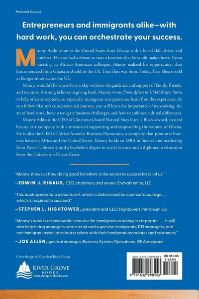 Entrepreneurs and immigrants alike-with hard work, you can orchestrate your success. Manny Addo came to the United States from Ghana with a lot of skill, drive, and intellect. He also had a dream to start a business that he could make thrive. Upon meeting an African American Colleague, Manny realized his opportunity: shea butter sourced from Ghana and sold in the US. True Shea was born. Today, True Shea is sold in Kroger stores across the US. Manny wouldn't be where he is today without the guidance and support of family, friends, and mentors. A strong believer in giving back, Manny wrote From Africa to 1,500 Kroger Stores to help other entrepreneurs, especially immigrant entrepreneurs, learn from his experience. As you follow Manny's entrepreneurial journey, you can learn the importance of networking, the art of hard work, how to navigate business challenges, and how to embrace cultural differences. Manny Addo is the CEO of Cincinnati-based Natural Shea Care, a Black-owned, natural beauty care company with a mission of supporting and empowering the women of Ghana. He is also the CEO of Africa America Business Promotion, a company that promotes business between Africa and the United States. Manny holds an MBA in finance and marketing from Xavier University and a bachelor's degree in social science and a diploma in education from the University of Cape Coast.