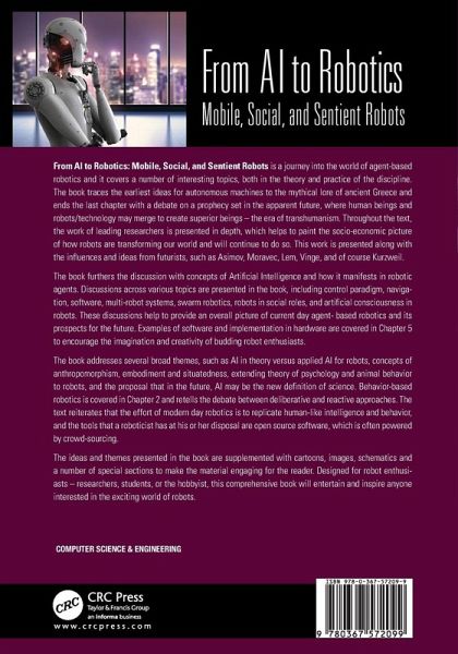 From AI to Robotics: Mobile, Social, and Sentient Robots is a journey into the world of agent-based robotics and it covers a number of interesting topics, both in the theory and practice of the discipline. The book traces the earliest ideas for autonomous machines to the mythical lore of ancient Greece and ends the last chapter with a debate on a prophecy set in the apparent future, where human beings and robots/technology may merge to create superior beings - the era of transhumanism. Throughout the text, the work of leading researchers is presented in depth, which helps to paint the socio-economic picture of how robots are transforming our world and will continue to do so. This work is presented along with the influences and ideas from futurists, such as Asimov, Moravec, Lem, Vinge, and of course Kurzweil. The book furthers the discussion with concepts of Artificial Intelligence and how it manifests in robotic agents. Discussions across various topics are presented in the book, including control paradigm, navigation, software, multi-robot systems, swarm robotics, robots in social roles, and artificial consciousness in robots. These discussions help to provide an overall picture of current day agent- based robotics and its prospects for the future. Examples of software and implementation in hardware are covered in Chapter 5 to encourage the imagination and creativity of budding robot enthusiasts. The book addresses several broad themes, such as AI in theory versus applied AI for robots, concepts of anthropomorphism, embodiment and situatedness, extending theory of psychology and animal behavior to robots, and the proposal that in the future, AI may be the new definition of science. Behavior-based robotics is covered in Chapter 2 and retells the debate between deliberative and reactive approaches. The text reiterates that the effort of modern day robotics is to replicate human-like intelligence and behavior, and the tools that a roboticist has at his or her disposal are open source software, which is often powered by crowd-sourcing. Open source meta-projects, such as Robot Operating System (ROS), etc. are briefly discussed in Chapter 5. The ideas and themes presented in the book are supplemented with cartoons, images, schematics and a number of special sections to make the material engaging for the reader. Designed for robot enthusiasts - researchers, students, or the hobbyist, this comprehensive book will entertain and inspire anyone interested in the exciting world of robots.