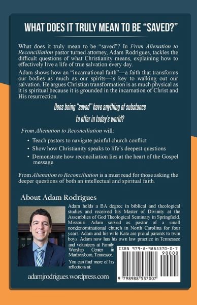Does Being "Saved" Have Anything of Substance to Offer in Today's World? What does it truly mean to be "saved"? In From Alienation to Reconciliation pastor turned attorney, Adam Rodrigues, tackles the difficult questions of what Christianity means, explaining how to effectively live a life of true salvation every day. Adam shows how an "incarnational faith"-a faith that transforms our bodies as much as our spirits-is key to walking out our salvation. He argues Christian transformation is as much physical as it is spiritual because it is grounded in the incarnation of Christ and His resurrection. From Alienation to Reconciliation will:Teach pastors to navigate painful church conflict Show how Christianity speaks to life's deepest questions Demonstrate how reconciliation lies at the heart of the Gospel message ¿¿From Alienation to Reconciliation is a must read for those asking the deeper questions of both an intellectual and spiritual faith.