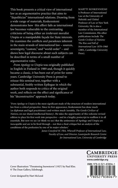 This book presents a critical view of international law as an argumentative practice that aims to 'depoliticise' international relations. Drawing from a range of materials, Koskenniemi demonstrates how international law becomes vulnerable to the contrasting criticisms of being either an irrelevant moralist Utopia or a manipulable façade for State interests. He examines the conflicts inherent in international law - sources, sovereignty, 'custom' and 'world order' - and shows how legal discourse about such subjects can be described in terms of a small number of argumentative rules. This book was originally published in English in Finland in 1989 and though it quickly became a classic, it has been out of print for some years. In 2006, Cambridge was proud to reissue this seminal text, together with a freshly written Epilogue in which the author both responds to critiques of the original work, and reflects on the effect and significance of his 'deconstructive' approach today.