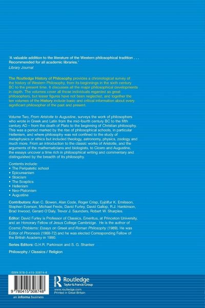 Volume 1 of the "Routledge History of Philosophy covers one of the most remarkable periods in human thought. The essays present the fundamental approaches and thinkers of Greek philosophy in chronological order. This second volume opens with Aristotle's immense influence on philosophy from the beginnings of Christian philosophy in the fifth century AD. "From Aristotle to Augustine surveys the work of philosophers who wrote in Greek and Latin from the mid-fourth century BC to the fifth century AD