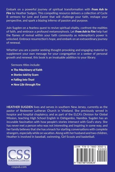 Embark on a powerful journey of spiritual transformation with From Ash to Fire by Heather Sudgen. This compelling sermon book delivers a collection of Cycle B sermons for Lent and Easter that will challenge your faith, reshape your perspective, and spark a blazing inferno of passion and purpose. Join Sugden on a fearless quest to revive your spiritual vitality, confront the realities of faith, and embrace a profound metamorphosis. Let From Ash to Fire fuel the flames of revival within you as you unlock redemption's power, embrace resurrection's hope, and embark on an extraordinary journey of renewal.Whether you are a pastor seeking thought-provoking and engaging material to supplement your own message for your congregation or a seeker of personal growth and renewal, this book is an invaluable resource. Sermons titles include: ¿ The Machinery of Faith¿ Stories told by Scars¿ Falling into Trust¿ New Life through Fire Heather Sugden lives and serves in southern New Jersey, currently as the pastor of Redeemer Lutheran Church in Vineland. She previously served in hospice and hospital chaplaincy, and as part of the ELCA's Division for Global Mission, teaching High School English in Oshigambo, Namibia. Sugden has an incurable fascination with how people's stories intersect with God's story. She has never met a person who was not interesting and inspiring in some way, and her family believes that she has a knack for starting conversations with complete strangers, especially while on vacation. Along with her husband and two children, Heather is involved in baseball, swimming, Girl Scouts and basketball.