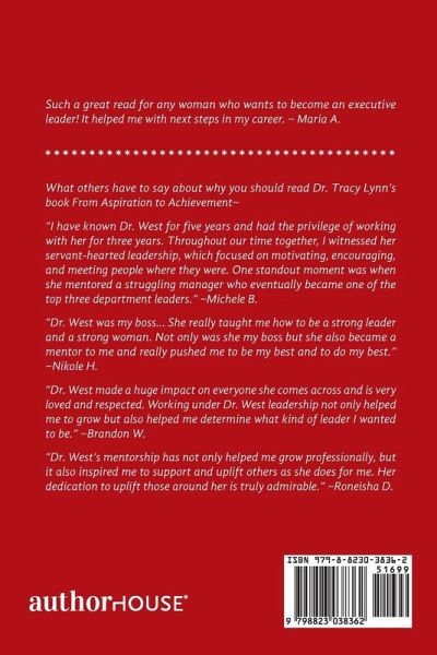 Such a great read for any woman who wants to become an executive leader! It helped me with next steps in my career. ~ Maria A. What others have to say about why you should read Dr. Tracy Lynn's book From Aspiration to Achievement~ "I have known Dr. West for five years and had the privilege of working with her for three years. Throughout our time together, I witnessed her servant-hearted leadership, which focused on motivating, encouraging, and meeting people where they were. One standout moment was when she mentored a struggling manager who eventually became one of the top three department…mehr