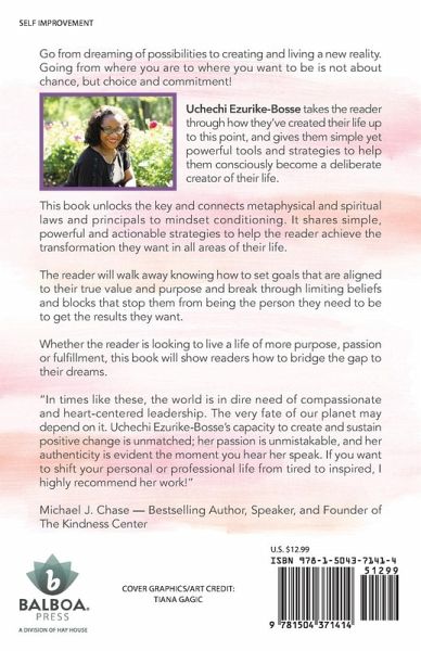 Go from dreaming of possibilities to creating and living a new reality. Going from where you are to where you want to be is not about chance, but choice and commitment! Uchechi Ezurike-Bosse takes the reader through how they’ve created their life up to this point, and gives them simple yet powerful tools and strategies to help them consciously become a deliberate creator of their life. This book unlocks the key and connects metaphysical and spiritual laws and principals to mindset conditioning. It shares simple, powerful and actionable strategies to help the reader achieve the transformation they want in all areas of their life. The reader will walk away knowing how to set goals that are aligned to their true value and purpose and break through limiting beliefs and blocks that stop them from being the person they need to be to get the results they want. Whether the reader is looking to live a life of more purpose, passion or fulfillment, this book will show readers how to bridge the gap to their dreams. "In times like these, the world is in dire need of compassionate and heart-centered leadership. The very fate of our planet may depend on it. Uchechi Ezurike-Bosse’s capacity to create and sustain positive change is unmatched; her passion is unmistakable, and her authenticity is evident the moment you hear her speak. If you want to shift your personal or professional life from tired to inspired, I highly recommend her work!" Michael J. Chase — Bestselling Author, Speaker, and Founder of The Kindness Center