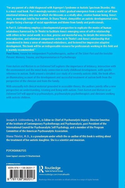 From Autism and Mutism to an Enlivened Self explores the importance of intimacy, interaction with the environment and the mind-body connection in early childhood development, with specific reference to autism. Built around a detailed case study of a severely autistic child, the book offers an illuminating account of the development and successful treatment of autism both from the perspective of the clinician and from the family. In Part I, Diana Thielst (writing under a pseudonym) gives a description of her experience with her daughter who was autistic at birth, minimally verbal at age five, and did not respond to her name. She details the severe family stress and her ineffectual attempts to get professional help. Finally, she hears of consultants who may be able to help in St. Petersburg, Russia. Guided by the consultants, Thielst and her daughter then embark on a uniquely innovative method for Anna to both build a vocabulary and for the first time learn the value of coordinated and cooperative effort. Armed with a vocabulary and a long history of solo pursuits of organizing inanimate objects, Anna suddenly begins to explore "human" interaction as revealed in comics- a turning on to an emotional life of relatedness and intimacy. In Part II, Joseph D. Lichtenberg uses his knowledge of neonate and early infancy to offer the reader an understanding of autism - its history - and a unique comparison of the normal well adapted neonate and infant at one year with the disrupted development of the child with autism. Lichtenberg's theoretical construct of three major pathways to a healthy adapted development breaks new theoretical ground and gives enrichment to a contemporary portrayal of the autistic experience. With unusually rich clinical material grounded in accessible theory, the authors jointly offer a new perspective on understanding, treating and living with autism. From Autism and Mutism to an Enlivened Self will appeal to psychoanalysts, psychoanalytic psychotherapists and clinicians working with autistic children.