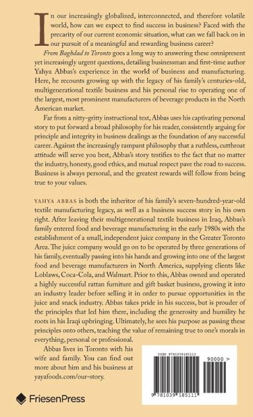 In our increasingly globalized, interconnected, and therefore volatile world, how can we expect to find success in business? Faced with the precarity of our current economic situation, what can we fall back on in our pursuit of a meaningful and rewarding business career? From Baghdad to Toronto goes a long way to answering these omnipresent yet increasingly urgent questions, detailing businessman and first time author Yahya Abbas's experience in the world of business and manufacturing. Here, he recounts growing up with the legacy of his family's centuries-old, multigenerational textile business and his personal rise to operating one of the largest, most prominent manufacturers of beverage products in the North American market. Far from a nitty-gritty instructional text, Abbas uses his captivating personal story to put forward a broad philosophy for his reader, consistently arguing for principle and integrity in business dealings as the foundation of any successful career. Against the increasingly rampant philosophy that a ruthless, cutthroat attitude will serve you best, Abbas's story testifies to the fact that no matter the industry, honesty, good ethics, and mutual respect pave the road to success. Business is always personal, and the greatest rewards will follow from being true to your values.