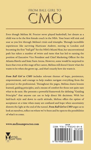 Even though Melissa M. Proctor never played basketball, her dream as a child was to be the first female coach in the NBA. Your heart will sink and soar as you live through Melissa's trials and triumphs. Through incredible experiences like surviving Hurricane Andrew, moving to London and becoming the first "ball girl" for the NBA's Miami Heat, her unconventional path has taken a number of twists and turns that has led to earning the position of Executive Vice President and Chief Marketing Officer for the Atlanta Hawks and State Farm Arena. However, some would be surprised to learn that even at this stage of her career, Melissa still doesn't know what she wants to be when she grows up...and that's exactly how she wants it. From Ball Girl to CMO includes relevant themes of hope, persistence, empowerment, and courage to help readers navigate everything from the personal to the professional. Throughout the pages, Melissa shares lessons learned, guiding principles, and a means of comfort for those not quite sure what to do next. She presents a powerful framework for defining "Guiding Principles" that anyone can use to help direct life decisions. With her laid-back style and down to earth attitude, Melissa offers the option of acceptance at a time when many are confused and hope when uncertainty distorts the light at the end of the tunnel. From Ball Girl to CMO urges us to look at ourselves, reflect on where we've been and be open to the possibilities of what's to come. www.melissamproctor.com