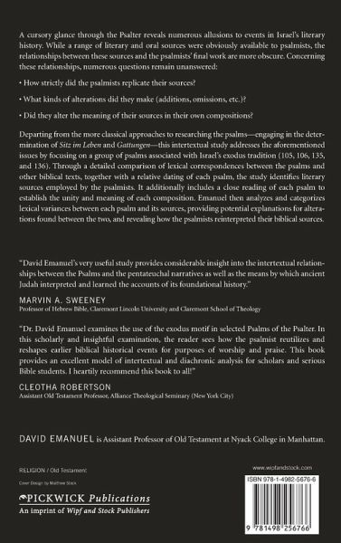 A cursory glance through the Psalter reveals numerous allusions to events in Israel's literary history. While a range of literary and oral sources were obviously available to psalmists, the relationships between these sources and the psalmists' final work are more obscure. Concerning these relationships, numerous questions remain unanswered: - How strictly did the psalmists replicate their sources? - What kinds of alterations did they make (additions, omissions, etc.)? - Did they alter the meaning of their sources in their own compositions? Departing from the more classical approaches to researching the psalms--engaging in the determination of Sitz im Leben and Gattungen--this intertextual study addresses the aforementioned issues by focusing on a group of psalms associated with Israel's exodus tradition (105, 106, 135, and 136). Through a detailed comparison of lexical correspondences between the psalms and other biblical texts, together with a relative dating of each psalm, the study identifies literary sources employed by the psalmists. It additionally includes a close reading of each psalm to establish the unity and meaning of each composition. Emanuel then analyzes and categorizes lexical variances between each psalm and its sources, providing potential explanations for alterations found between the two, and revealing how the psalmists reinterpreted their biblical sources.