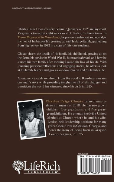 Charles Paige Choates story begins in January of 1925 in Baywood, Virginia, a town just eight miles west of Galax, his hometown. In From Baywood to Broadway, he presents an honest and nostalgic memoir of his bucolic life growing up with his large family, graduating from high school in 1942 in a class of fifty-one students. Choate shares the details of his family, his childhood, growing up on the farm, his service in World War II, his travels abroad, and how he started his own family after meeting Louise, the love of his life. With touching personal reflections and engaging stories, he offers a look at his family history and gives a window into his and his familys life. A testament to a life well-lived, From Baywood to Broadway narrates one mans story while providing insight into all of the changes and transitions the world has witnessed since his birth in 1925.