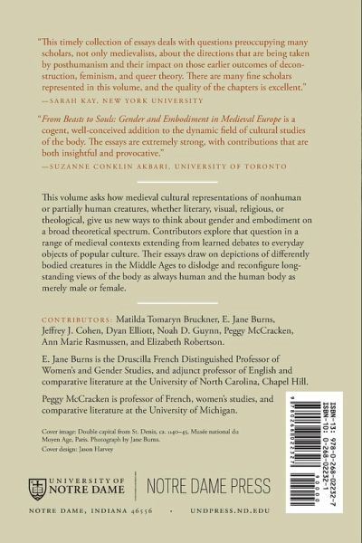 The Middle Ages provides a particularly rich trove of hybrid creatures, semi-human beings, and composite bodies: we need only consider manuscript pages and stone capitals in Romanesque churches to picture the myriad figures incorporating both human and animal elements that allow movement between, and even confusion of, components of each realm. From Beasts to Souls: Gender and Embodiment in Medieval Europe raises the issues of species and gender in tandem, asking readers to consider more fully what happens to gender in medieval representations of nonhuman embodiment. The contributors reflect on the gender of stones and the soul, of worms and dragons, showing that medieval cultural artifacts, whether literary, historical, or visual, do not limit questions of gender to predictable forms of human or semi-human embodiment. By expanding what counts as "the body" in medieval cultural studies, the essays shift our understanding of gendered embodiment and articulate new perspectives on its range, functions, and effects on a broader theoretical spectrum. Drawing on depictions of differently bodied creatures in the Middle Ages, they dislodge and reconfigure long-standing views of the body as always human and the human body as merely male and female. The essays address a number of cultural contexts and academic disciplines: from French and English literature to objects of Germanic and Netherlandish material culture, from theological debates to literary concerns with the soul. They engage with issues of gender and embodiment located in stones, skeletons, and snake tails, swan-knights, and werewolves, along with a host of other unexpected places in a thought-provoking addition to somatic cultural history. "From Beasts to Souls: Gender and Embodiment in Medieval Europe is a cogent, well-conceived addition to the dynamic field of cultural studies of the body. The essays are extremely strong, with contributions that are both insightful and provocative."-Suzanne Conklin Akbari, University of Toronto