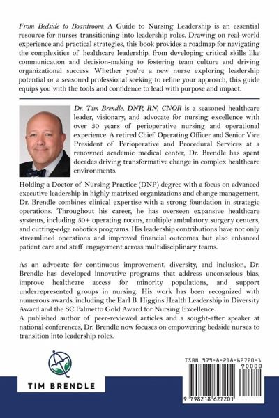 Dr. Tim Brendle, DNP, RN, CNOR is a seasoned healthcare leader, visionary, and advocate for nursing excellence with over 30 years of perioperative nursing and operational experience. A retired Chief Operating Officer and Senior Vice President of Perioperative and Procedural Services at a renowned academic medical center, Dr. Brendle has spent decades driving transformative change in complex healthcare environments.Holding a Doctor of Nursing Practice (DNP) degree with a focus on advanced executive leadership in highly matrixed organizations and change management, Dr. Brendle combines clinical expertise with a strong foundation in strategic operations. Throughout his career, he has overseen expansive healthcare systems, including 50+ operating rooms, multiple ambulatory surgery centers, and cutting-edge robotics programs. His leadership contributions have not only streamlined operations and improved financial outcomes but also enhanced patient care and staff engagement across multidisciplinary teams.As an advocate for continuous improvement, diversity, and inclusion, Dr. Brendle has developed innovative programs that address unconscious bias, improve healthcare access for minority populations, and support underrepresented groups in nursing. His work has been recognized with numerous awards, including the Earl B. Higgins Health Leadership in Diversity Award and the SC Palmetto Gold Award for Nursing Excellence.A published author of peer-reviewed articles and a sought-after speaker at national conferences, Dr. Brendle now focuses on empowering bedside nurses to transition into leadership roles. Through Quaternary Healthcare Consultancy, LLC, he provides mentorship, operational insights, and leadership coaching to the next generation of nurse leaders.In his book, From Bedside to Boardroom: A Guide to Nursing Leadership, Dr. Brendle shares his wealth of experience and actionable strategies to inspire and equip nurses for impactful leadership. The book reflects his passion for fostering purpose-driven, inclusive healthcare environments and commitment to shaping the future of nursing leadership. When not advocating for nurses, Dr. Brendle enjoys traveling, and French cooking.