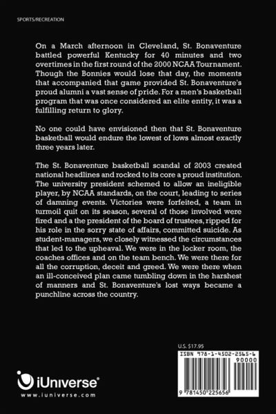On a March afternoon in Cleveland, St. Bonaventure battled powerful Kentucky for 40 minutes and two overtimes in the first round of the 2000 NCAA Tournament. Though the Bonnies would lose that day, the moments that accompanied that game provided St. Bonaventure's proud alumni a vast sense of pride. For a men's basketball program that was once considered an elite entity, it was fulfilling return to glory. No one could have envisioned then that St. Bonaventure basketball would endure lowest of lows almost exactly three years later. The St. Bonaventure basketball scandal of 2003 created national headlines and rocked to its core a proud institution. The university president schemed to allow an ineligible player, by NCAA standards, on the court, leading to series of damning events. Victories were forfeited, a team in turmoil quit on its season, several of those involved were fired and a the president of the board of trustees, ripped by his role in the sorry state of affairs, committed suicide. As student-managers, we closely witnessed the circumstances that led to the upheaval. We were in the locker room, the coaches offices and on the team bench. We were there for all the corruption, deceit and greed. We were there when an ill-conceived plan came tumbling down in the harshest of manners and St. Bonaventure's lost ways became a punchline across the country.