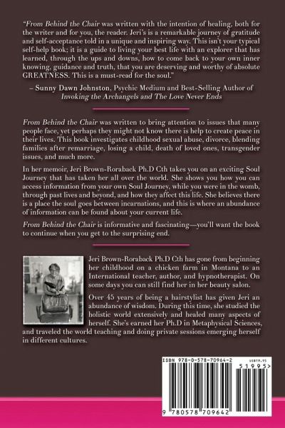 From Behind the Chair was written to bring attention to issues that many people face, yet perhaps they might not know there is help to create peace in their lives. This book investigates childhood sexual abuse, divorce, blending families after remarriage, losing a child, death of loved ones, transgender issues, and much more. In her memoir, Jeri Brown-Roraback Ph.D Cth takes you on an exciting Soul Journey that has taken her all over the world. She shows you how you can access information from your own Soul Journey while you were in the womb, through past lives and beyond, and how they affect this life. She believes there is a place the soul goes between incarnations, and this is where an abundance of information can be found about your current life. From Behind the Chair is informative and fascinating-you'll want the book to continue when you get to the surprising end.