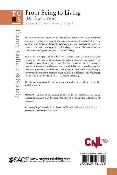 This new English translation of François Jullien s work is a compelling summation of his thinking on the comparison between Western and Chinese thought. The title, From Being to Living, summarises his essential point: that western thinking is obsessed by and determined as well as limited by the notion of Being, whereas traditional Chinese thought was always situated in Living.
