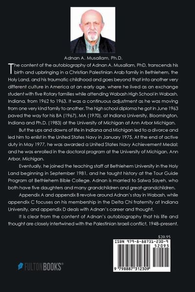 The content of the autobiography of Adnan A. Musallam, PhD, transcends his birth and upbringing in a Christian Palestinian Arab family in Bethlehem, the Holy Land, and his traumatic childhood and goes beyond that into another very different culture in America at an early age, where he lived as an exchange student with five Rotary families while attending Wabash High School in Wabash, Indiana, from 1962 to 1963. It was a continuous adjustment as he was moving from one very kind family to another. The high school diploma he got in June 1963 paved the way for his BA (1967), MA (1970), at Indiana University, Bloomington, Indiana and Ph.D. (1983) at the University of Michigan at Ann Arbor Michigan. But the ups and downs of life in Indiana and Michigan led to a divorce and led him to enlist in the United States Navy in January 1975. At the end of active duty in May 1977, he was awarded a United States Navy Achievement Medal; and he was enrolled in the doctoral program at the University of Michigan, Ann Arbor, Michigan. Eventually, he joined the teaching staff at Bethlehem University in the Holy Land beginning in September 1981, and he taught history at the Tour Guide Program at Bethlehem Bible College. Adnan is married to Salwa Sayeh, who both have five daughters and many grandchildren and great-grandchildren. Appendix A and appendix B revolve around Adnan's stay in Wabash, while appendix C focuses on his membership in the Delta Chi fraternity at Indiana University, and appendix D deals with Adnan's career and thought. It is clear from the content of Adnan's autobiography that his life and thought are closely intertwined with the Palestinian Israeli conflict, 1948-present. 44