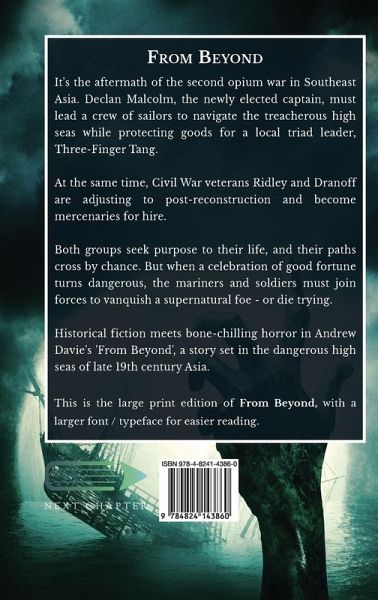 It's the aftermath of the second opium war in Southeast Asia. Declan Malcolm, the newly elected captain, must lead a crew of sailors to navigate the treacherous high seas while protecting goods for a local triad leader, Three-Finger Tang. At the same time, Civil War veterans Ridley and Dranoff are adjusting to post-reconstruction and become mercenaries for hire. Both groups seek purpose to their life, and their paths cross by chance. But when a celebration of good fortune turns dangerous, the mariners and soldiers must join forces to vanquish a supernatural foe - or die trying. Historical fiction meets bone-chilling horror in Andrew Davie's 'From Beyond', a story set in the dangerous high seas of late 19th century Asia. This is the large print edition of From Beyond, with a larger font / typeface for easier reading.