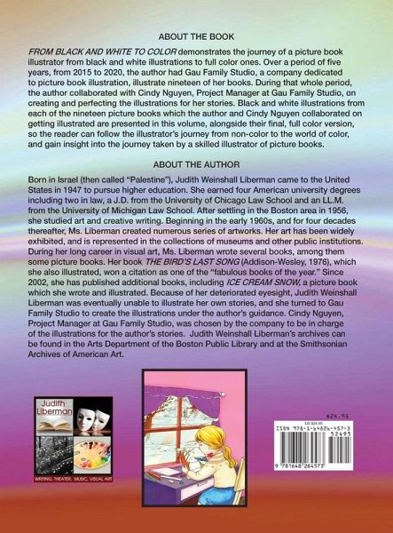 FROM BLACK AND WHITE TO COLOR demonstrates the journey of a picture book illustrator from black and white illustrations to full color ones. Over a period of five years, from 2015 to 2020, the author had Gau Family Studio, a company dedicated to picture book illustration, illustrate nineteen of her books. During that whole period, the author collaborated with Cindy Nguyen, Project Manager at Gau Family Studio, on creating and perfecting the illustrations for her stories. Black and white illustrations from each of the nineteen picture books which the author and Cindy Nguyen collaborated on getting illustrated are presented in this volume, alongside their final, full color version, so the reader can follow the illustrator's journey from non-color to the world of color, and gain insight into the journey taken by a skilled illustrator of picture books.