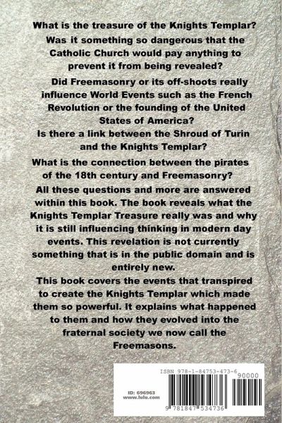 Have you ever wondered How the Knights Templar was created? Why they frightened the Church so much with their secrets? Or why they were destroyed and evolved into modern day Freemasonry? Well this is a very readable account of the complete history of the founding of the Knights Templar. Why they were formed. What the treasure was that they found and why it frightened the church so much. How they were destroyed and who destroyed them and how they formed into the present day Freemasons. Written by a Freemason who has tried to understand all the Masonic Orders and their ceremonies that he has joined. The interpretations of which gives a very enlightening insight into politics and religion of the last 3000 years. The hypothesis on the treasure is something that is not currently in the public domain and is entirely new.