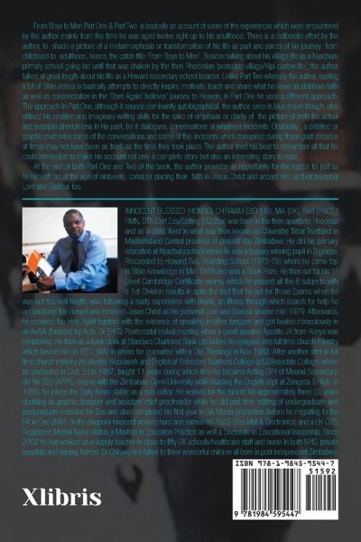 From Boys to Men Part One & Part Two is basically an account of some of the experiences which were encountered by the author mainly from the time he was aged twelve right up to his adulthood. There is a deliberate effort by the author, to shade a picture of a metarmorphosis or transformation of his life as part and parcel of his journey from childhood to adulthood, hence, the catch title 'From Boys to Men'. Besides talking about his village life as a Nyachuru primary school going lad until that was shaken by the then Rhodesian 'protected village/Kipi curfew life', the author talked at great length about his life as a Howard secondary school boarder. Unlike Part Two whereby the author, quoting a lot of Bible verses is basically attempts to directly inspire, motivate, teach and share what he views as stubborn faith as well as consencration in the 'Born Again' believer' journey to Heaven, in Part One he uses a different approach. The approach in Part One, although it sounds dominantly autobigraphical, the author, once in blue moon though, also utilised his creative and imaginary writing skills for the sake of emphasis or clarity of the picture of both the actual and possible phenomena in his past, be it dialogues, conversations or whatever incidents. Obviously , a detailed or graphic memories some of the conversations and some of the incidents which transpired during those past decades at times may not have been as fresh as the time they took place. The author tried his best to remember all that he could remember to make his account not only a complete story but also an interesting story to read. At the end of both Part One and Two of the book, the author provides an opportunity for the reader to, just as he himself did at the age of ninteeen, consider placing their faith in Jesus Christ and accept Him as their personal Lord and Saviour too.
