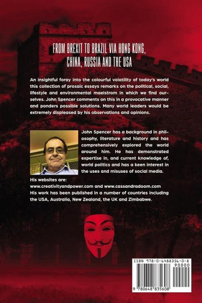 FROM BREXIT TO BRAZIL VIA HONG KONG, CHINA, RUSSIA AND THE USA An insightful foray into the colourful volatility of today's world this collection of prosaic essays remarks on the political, social, lifestyle and environmental maelstrom in which we find ourselves. John Spencer comments on this in a provocative manner and ponders possible solutions. Many world leaders would be extremely displeased by his observations and opinions.China's ruthless expansionism, evidenced by the suppression of democracy in Hong Kong and its bullying threats to Taiwan, is one of many issues discussed. John has closely followed events and trends in our world for many years. The issues that bother many people have intensely concerned him and he wishes to promote further discussion in the search for available solutions.The trend to elect populist leaders without due regard to the consequences is one of his lines of inquiry. Others include the ever increasing disappearance of freedom, the increasing human overpopulation, along with its aging, and the looming environmental disaster. Some of the essays point to the likelihood of such pandemics as COVID-19 as well as the early demise of the elderly. Greed, stupidity and overpopulation are closely examined as is the predilection of the young for danger.