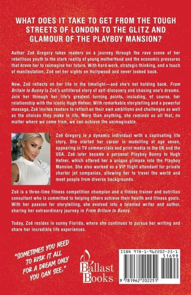 What does it take to get from the tough streets of London to the glitz and glamour of the Playboy Mansion? Author Zoë Gregory takes readers on a journey through the rave scene of her rebellious youth to the stark reality of young motherhood and the economic pressures that drove her to reimagine her future. With hard work, strategic thinking, and a touch of manifestation, Zoë set her sights on Hollywood and never looked back. Now, Zoë reflects on her life in the limelight-and she's not holding back. From Britain to Bunny is Zoë's unfiltered story of self-discovery and chasing one's dreams. Join her through her life's greatest turning points, including, of course, her relationship with the iconic Hugh Hefner. With remarkable storytelling and a powerful message, Zoë invites readers to reflect on their own ambitions and challenges as well as the choices they make in life. More than anything, she reminds us all that, no matter where we come from, we can achieve the unimaginable.