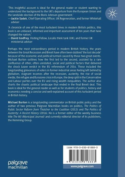 Perhaps the most extraordinary period in modern British history, the years between the Great Recession and Brexit have often been dubbed 'the lost decade' because of the economic and political turmoil caused by those two great events. Michael Burton outlines how the first led to the second, assisted by a rare confluence of other, often unrelated, social and political factors that delivered the shock Leave verdict in the EU referendum of 2016. These included the longstanding grievances of voters in former industrial areas feeling left behind by globalism, stagnant incomes after the recession, austerity, the rise of social media, the refugee and Eurozone crisis in Europe, the deep split in the Conservative and Labour parties over the EU and rising wealth inequalities. The author also charts the chaotic political landscape that ended in the final Brexit deal. This book is ideal for the general reader as well as for students of politics, history and economics needing a concise andwell-explained account of this turbulent period in British history.