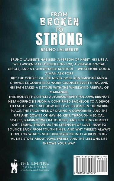 Bruno Laliberte has been a person of habit, his life a well-worn map. A fulfilling job, a vibrant social circle, and a comfortable solitude - what more could a man ask for? But the course of life never does run smooth and a chance encounter at work changes everything and his path takes a detour with the whirlwind arrival of Marianne. This honest heartfelt autobiography follows Bruno's metamorphosis from a confirmed bachelor to a devoted father. We'll see how his love blooms in the workplace, the trickiness of dating a coworker, and the ups and downs of having kids. Through medical scares, raising two daughters, and figuring himself out, Bruno shows us the strength of love, how to bounce back from tough times, and why there's always hope for what's next. Discover Bruno Laliberte's real-life story about love, family, and the lessons life throws your way.