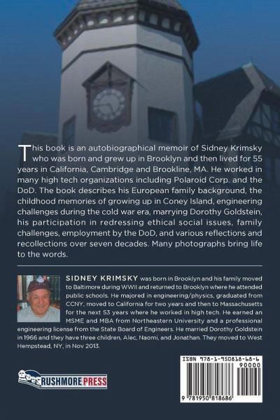 This book is an autobiographical memoir of Sidney Krimsky who was born and grew up in Brooklyn and then lived for 55 years in California, Cambridge and Brookline, MA. He worked in many high tech organizations including Polaroid Corp. and the DoD. The book describes his European family background, the childhood memories of growing up in Coney Island, engineering challenges during the cold war era, marrying Dorothy Goldstein, his participation in redressing ethical social issues, family challenges, employment by the DoD, and various reflections and recollections over seven decades. Many photographs bring life to the words.