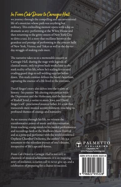 WINNER ¿ Literary Titan Gold Award ¿ Readers' Favorite Five-Star Review FINALIST ¿ National Indie Excellence Awards ¿ Indie Book Awards PRAISE FROM KIRKUS REVIEWS: "An intimate, candid look at the highs and lows of one musician's artistic pursuit." "From Cab Driver to Carnegie Hall shows how effort and perseverance can turn dreams into reality...a testament to inspiration and resilience." - Readers' Favorite 5-Star Review Dive into an Inspiring Journey from NYC Streets to the Grand Stages of the World: A Musician's Tale of Grit and Glory One afternoon David Singer was performing at the White House and that evening he was back behind the wheel of a New York City taxi. He shared the stage at Carnegie Hall with legends of classical music, only to find himself weeks later scaling fences and evading guard dogs to sell welding supplies before dawn. Through these vivid extremes, Singer's memoir captures not only the challenges of a life in music but also the resilience and determination required to keep moving forward. His story is rooted in history-his parents' experiences during the Depression and the Holocaust-and shaped by the profound mentorship of Rudolf Jettel, a savior to many Jews and Singer's self-proclaimed "musical father." From teaching young musicians to acclaimed performances at the Marlboro Music Festival and with the Grammy Award-winning Orpheus Chamber Orchestra, Singer's journey is a powerful reminder of the transformative power of music, perseverance, and never giving up. From Cab Driver to Carnegie Hall is not only a chronicle of musical achievement-it is an inspiring story of resilience and triumph that will resonate with dreamers, strivers, and music lovers alike.