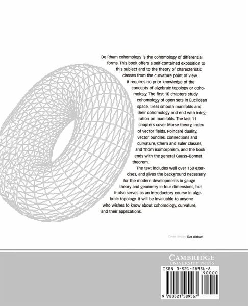 De Rham cohomology is the cohomology of differential forms. This book offers a self-contained exposition to this subject and to the theory of characteristic classes from the curvature point of view. It requires no prior knowledge of the concepts of algebraic topology or cohomology. The first ten chapters study cohomology of open sets in Euclidean space, treat smooth manifolds and their cohomology and end with integration on manifolds. The last eleven chapters include Morse theory, index of vector fields, Poincaré duality, vector bundles, connections and curvature, and the book ends with the general Gauss-Bonnet theorem. The text includes well over 150 exercises, and gives the background to the modern developments in gauge theory and geometry in four dimensions, but it also serves as an introductory course in algebraic topology. It will be invaluable to anyone studying cohomology, curvature, and their applications.