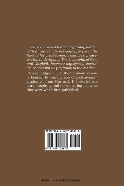 I have conceived that a biography, written with a view to interest young people in the facts of his great career, would be a praiseworthy undertaking. The biography of General Garfield, however imperfectly executed, cannot but be profitable to the reader. Horatio Alger, Jr. authored about seventy books. He was the son of a clergyman, graduated from Harvard. His stories are pure, inspiring and as endearing today as they were when first published.