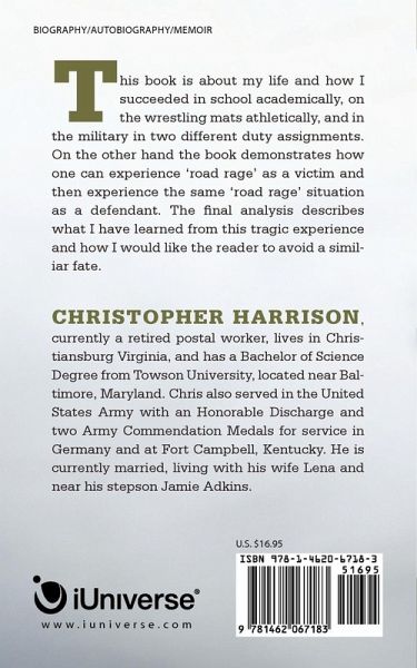 This book is about my life and how I succeeded in school academically, on the wrestling mats athletically, and in the military in two different duty assignments. On the other hand the book demonstrates how one can experience 'road rage' as a victim and then experience the same 'road rage' situation as a defendant. The final analysis describes what I have learned from this tragic experience and how I would like the reader to avoid a similiar fate.