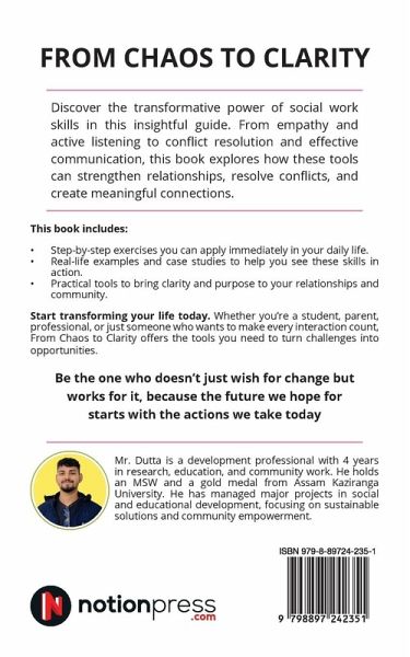 Book Description Feeling stuck in a whirlwind of miscommunication, disconnection, or conflict? This book is your roadmap to clarity and connection. Imagine a life where you confidently handle challenges, build stronger relationships, and create a positive impact on the world around you. In this completely comprehensive book, you'll learn: How to overcome disconnection, miscommunication, and conflict with ease. Learn to harness tools like active listening, empathy, and conflict resolution to create deeper connections, foster understanding, and build stronger communities. Discover how to navigate life's challenges with confidence, communicate effectively, and embrace compassion in every interaction. This book includes: Step-by-step exercises you can apply immediately in your daily life. Real-life examples and case studies to help you see these skills in action. Practical tools to bring clarity and purpose to your relationships and community. Start transforming your life today. Whether you're a student, parent, professional, or just someone who wants to make every interaction count, From Chaos to Clarity offers the tools you need to turn challenges into opportunities. Don't wait! Start living your best life-click the BUY NOW button at the top to grab your copy before the price changes!
