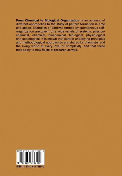 I General Concepts.- From Chemical to Biological Organization: A Snapshot.- Pattern Formation: Thermodynamics or Kinetics?.- Spatiotemporal Organization in Biological and Chemical Systems: Historical Review.- Velocity Correlations and Irreversibility: A Molecular Dynamics Approach.- Nonlinear Dynamics, Self-Organization and the Symbolic Representation of Complexity.- Spectral Kinetics and the Efficiency of (Bio) Chemical Reactions.- II Chemical Organization.- Distinction Between Amplified Noise and Deterministic Chaos by the Correlation Dimension.- Exotic Chemical Reactions with Cu(II) Catalyst.- Bifurcation, Periodicity and Chaos by Thermal Effects in Heterogeneous Catalysis.- Spatial Patterns in (Bio)Chemical Reactions.- Experimental Study of the Target Patterns of the BZ Reaction Using Digital Picture Analysis.- Dispersion Curves and Pulse Wave Propagation in Excitable Systems.- Chemical Structures and Convection.- The Path to Hydrodynamic Instability During Reactions at Liquid Interfaces: Comparison of Experimental Image Analysis Results and Simulations.- Cellular Automata Simulating the Evolution of Structure Through the Synchronization of Oscillators.- III Biochemical Organization.- Potential Functions and Molecular Evolution.- Stochastic and Chaotic Processes in Biochemical Systems.- Protein Complexity.- Chemical Turnover and the Rate of Heat Production in Complex Reaction Systems.- Pattern Formation by Coupled Oscillations: The Pigmentation Patterns on the Shells of Molluscs.- Nonlinear Polymerization of Fibrinogen.- IV Cellular and Intercellular Organization.- Dynamic Phenomena in Molecular and Cellular Biology.- Thermodynamics of Energy Conversion in the Cell.- Cell Lineage and Segmentation in Development.- Models of Cytoplasmic Motion.- Developmental Controlof a Biological Rhythm: The Onset of Cyclic AMP Oscillations in Dictyostelium Cells.- Periodic Cell Communication in Dictyostelium discoideum.- V From Complex Cellular Networks to the Brain.- Memory and Paralysis Phenomena in the Immune Response: Interpretation in Terms of Multiple Steady State Transitions.- Spatiotemporal Patterns of Block in an Ionic Model of Cardiac Purkinje Fibre.- Perturbations of Next-Period Functions: Applications to Circadian Rhythms.- Brain Development and Self-Organization.- Do Coherent Patterns of the Strange Attractor EEG Reflect Deterministic Sensory-Cognitive States of the Brain?.- The Creutzfeld-Jakob Disease in the Hierarchy of Chaotic Attractors.- VI Ecological, Epidemiological and Economical Organization.- Ecosystems Under Varying Ambient Conditions.- Periodic and Chaotic Dynamics in Childhood Infections.- Analysis of Life Processes and Economic Systems by Methods of Thermodynamics.- Index of Contributors.