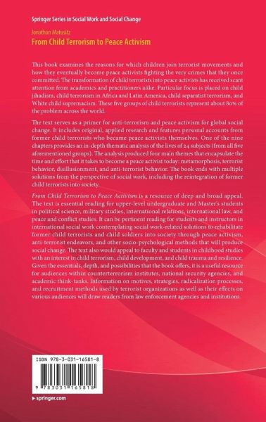 The text serves as a primer for anti-terrorism and peace activism for global social change. It includes original, applied research and features personal accounts from former child terrorists who became peace activists themselves. One of the nine chapters provides an in-depth thematic analysis of the lives of 24 subjects (from all five aforementioned groups). The analysis produced four main themes that encapsulate the time and effort that it takes to become a peace activist today: metamorphosis, terrorist behavior, disillusionment, and anti-terrorist behavior. The book ends with multiple solutions from the perspective of social work, including the reintegration of former child terrorists into society.