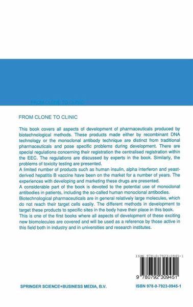 One: Registration, Toxicity and Quality Control.- 1. Toxicity testing of rDNA products.- 2. Experiences with the EC "high tech" procedure.- 3. The regulation of pharmaceuticals: philosophy and principles.- 4. Quality control of vaccines.- 5. Regulatory affairs and biotechnology in Europe: the CPMP "high tech" and multistate procedures.- 6. Formulating biotechnology products.- 7. Development of analytical methods for monitoring the stability of antibody formation by hybridoma cells in continuous culture systems.- Two: Monoclonal Antibodies.- 8. Toward human monoclonal antibodies.- 9. Biodistribution, binding and internalisation of monoclonal antibodies to human ovarian carcinoma cells.- 10. Pharmacokinetics and tissue distribution of Indium-111-labeled OV-TL 3 F(ab')2 in ovarian cancer patients.- 11. Characterization of human monoclonal antibodies specific for the rabies virus.- 12. Biochemical and immunological evaluation of an anti-fibrin monoclonal antibody complex containing T2Gls Fab' intended for imaging venous thrombi.- 13. Monoclonal antibodies in radioimmunoscintigraphy. Some hurdles between clone and clinic.- 14. Clinical relevance of the tumor marker CA 15.3 in the management of cancer patients.- 15. Practical applications of monoclonal antibodies against polymorphic epithelial mucin in the differential diagnosis of human tumors.- 16. Selection of monoclonal anti-digoxin antibodies suitable for monitoring of cardiac glycosides.- 17. Diagnostic use of anti-modified nucleoside monoclonal antibodies.- 18. Monoclonal antibodies radiolabeled with different radioisotopes for biodistribution and radioimmunodetection of tumor xenografts in the nude rat.- 19. Bispecific monoclonal antibody (BIAB)-retargeted cellular therapy for local treatment of cancer patients.- 20. Enhanced binding of t-PA to fibrin using bispecific monoclonal antibodies.- 21. Recent developments and perspectives on the future of human and murine monoclonal antibodies in the diagnosis and treatment of cancer.- 22. Pharmacokinetics and safety of a human IGM antibody, HA-1A.- 23. Development and clinical experience with humanised monoclonal antibodies.- 24. A method for the transformation of hybridoma cell lines with improved efficiency: its use in the production of bispecific monoclonal antibodies.- 25. To an optimal design of an airlift bioreactor for the cultivation of hybridomas.- Three: Marketed Products.- 26. Experience with marketed biotech products: rt-PA.- 27. Clinical trial of recombinant human IL-2 in the treatment of Mycobacterium Avium complex infection.- 28. Use of recombinant human erythropoietin in anemic dialysis patients.- 29. Experience with biosynthetic growth hormone.- Four: New Products.- 30. Recombinant follicle stimulating hormone. I. Construction, selection and characterization of a cell line.- 31. Recombinant human follicle stimulating hormone. II. Biochemical and biological characteristics.- 32. Heterologous expression of human Interleukin-3.- 33. Purification of recombinant human Interleukin-3 from Bacillus Licheniformis.- 34. The acid- and thermolabile interferon alpha: a subtype, or a new cell inhibitor?.- 35. The IFN? receptor as tool for the discovery of new immunomodulatory drugs.- 36. Cloned receptors and transfected cell lines in the design of new drugs: muscarinic cholinergic receptors.- Five: Drug Delivery.- 37. Structural analysis of carbohydrate chains of native and recombinant-DNA glycoproteins.- 38. The role of protein structure in surface tension kinetics.- 39. Antigen carriers: a success determining factor for subunit vaccines?.- 40. Intranasal delivery of insulin: absorption enhancement by the fusidate derivative STDHF in rabbits and rats and effects on human nasal ciliary movement in vitro.- 41. Improved oral peptide delivery by means of mucoadhesion.- 42. Delivery of therapeutic peptides and proteins.- 43. Compatibility studies of a soluble T4 receptor with a microinfusion pump for continuous intravenous thera...