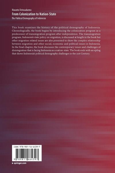 This book examines the history of the political demography of Indonesia. Chronologically, the book begins by introducing the colonization program as a predecessor of transmigration program after independence. The transmigration program, Indonesia's state policy on migration, is discussed at length in the book but other migration related issues are also presented to show the complex relationship between migration and other social, economic and political issues in Indonesia. In the final chapter, the book discusses the contemporary issues and challenges of disintegration that is facing Indonesia as a nation-state. The book ends with an epilog that shows Indonesia's political demography challenges in the 21st Century.