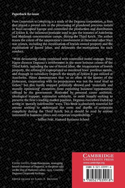 From Cooperation to Complicity is a study of the Degussa corporation, a firm which played a pivotal role in the processing of plundered precious metals in Nazi-occupied Europe and controlled the production and distribution of Zyklon B, the infamous pesticide used to gas the inmates of Auschwitz and Majdanek concentration camps, during the Third Reich. The author traces the extent of the corporation's involvement in these and other Nazi war crimes, including the Aryanization of Jewish-owned property and the exploitation of forced labour, and delineates the motivations for such conduct.