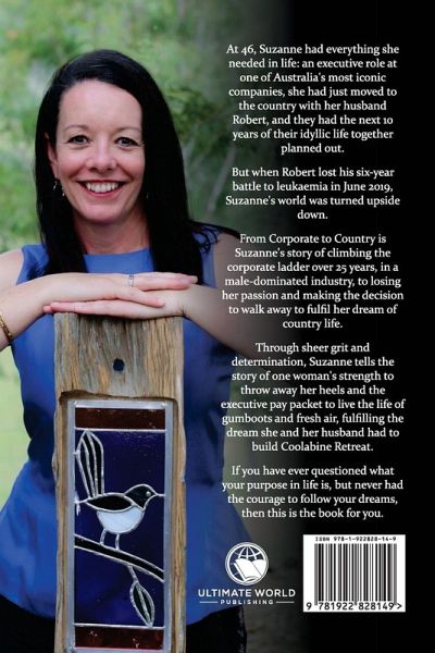 At 46, Suzanne had everything she needed in life: an executive role at one of Australia's most iconic companies, she had just moved to the country with her husband Robert, and they had the next 10 years of their idyllic life together planned out. But when Robert lost his six-year battle to leukaemia in June 2019, Suzanne's world was turned upside down. From Corporate to Country is Suzanne's story of climbing the corporate ladder over 25 years, in a male-dominated industry, to losing her passion and making the decision to walk away to fulfil her dream of country life. Through sheer grit and determination, Suzanne tells the story of one woman's strength to throw away her heels and the executive pay packet to live the life of gumboots and fresh air, fulfilling the dream she and her husband had to build Coolabine Retreat. If you have ever questioned what your purpose in life is, but never had the courage to follow your dreams, then this is the book for you.