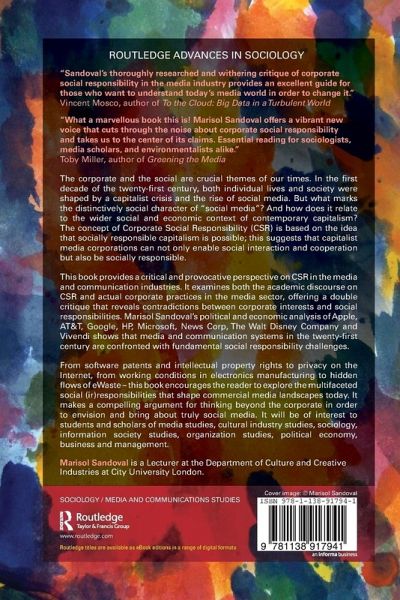 The corporate and the social are crucial themes of our times. In the first decade of the twenty-first century, both individual lives and society were shaped by capitalist crisis and the rise of social media. But what marks the distinctively social character of "social media"? And how does it relate to the wider social and economic context of contemporary capitalism? The concept of Corporate Social Responsibility (CSR) is based on the idea that a socially responsible capitalism is possible; this suggests that capitalist media corporations can not only enable social interaction and cooperation but also be socially responsible. This book provides a critical and provocative perspective on Corporate Social Responsibility (CSR) in media and communication industries. It examines both the academic discourse on CSR and actual corporate practices in the media sector, offering a double critique that reveals contradictions between corporate interests and social responsibilities. Marisol Sandoval's political economic analysis of Apple, AT&T, Google, HP, Microsoft, News Corp, The Walt Disney Company and Vivendi shows that media and communication in the twenty-first century are confronted with fundamental social responsibility challenges. From software patents and intellectual property rights to privacy on the Internet, from working conditions in electronics manufacturing to hidden flows of eWaste - this book encourages the reader to explore the multifaceted social (ir)responsibilities that shape commercial media landscapes today. It makes a compelling argument for thinking beyond the corporate in order to envision and bring about truly social media. It will interest students and scholars of media studies, cultural industry studies, sociology, information society studies, organization studies, political economy, business and management.