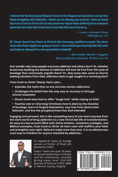 God's Blessing of Hope for Your Addiction Recovery Awaits You! From Crack to Christ: Twenty Years Later is an often hard-biting, autobiography chronicling a season depicting one man's journey from the pits of hell into God's marvelous light. The journey begins with an inside view of addiction to crack cocaine. This view includes the twisted mindset of the addicted and their inability to escape the bondage of casual sex, alcoholism, substance abuse, and other destructive personal behavior. Through many real-life and practical substance abuse recovery lessons, this overcoming addiction journey culminates with family restoration, and living in the abundance of God's prosperity. Dr. Towns' willingness to transparently share events and scenarios that others are either unable or unwilling to reveal, in Christian living books, proves invaluable. Few in ministry, clinical circles, or deliverance ministry books, have had a glimpse into this world. Even fewer subjects of addiction recovery books have themselves survived its trappings. From Crack to Christ: Twenty Years Later is comprised of five parts. Part One: LOST describes living a destructive lifestyle beyond man's reach. In this section, Towns exposes a myriad of plots and plans of the enemy. Spiritual warfare transpires on these pages, and because knowledge is power, the reader is strategically strengthened. Part Two explains REDEMPTION. This offered explanation encompasses the process of being rescued from captivity, emphatically expounding upon extrication from trouble and sin. Towns' journey also delves into the troubled psyche of those new to the gift of salvation, and their inability to forgive themselves. Part Three progresses to RESTORATION. This section explains some of God's expectations of the believer having progressed through the process of renewal and revival. It reveals the act of giving back something to one deprived of it. Furthermore, if restoration is the ability to put back into an unimpaired or much-improved condition, Towns' work helps believers see God's constructive work in their lives. Part Four addresses how Christians can live the PROSPERED lives God intended. Sometimes, experiencing God's prosperity follows the reality that we bear the responsibility of keeping ourselves from being held back. These lessons help us to see a way through the storms in our lives to know that the Son is still shining. Finally, Part Five is an all-new, one-chapter conclusion aptly dubbed the BENEDICTION. In this section, Dr. Towns shares the highs and lows he has experienced over the twenty-five years since his divinely-inspired substance abuse treatment. Through it all, Towns demonstrates that he is a walking, talking, living, breathing, fire-baptised, miracle of the Lord. From Crack to Christ: Twenty Years Later is told in an easy to read, personal manner with simplistic, revelatory analogies. The entire work is filled with divine wisdom confirmed by Biblical examples reaffirming one's faith and strengthening one's spirit. This new edition retains most of the original structure and composition of the first edition (From Crack to Christ), while boasting fresh editing and a new Foreword. With powerful storytelling and interwoven messages of hope and Bible-based truths-all intended to engage and inspire a new generation of beneficiaries.