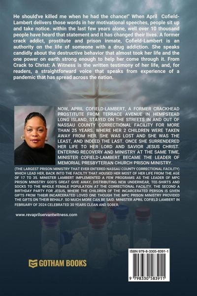 "He should've killed me when he had the chance!" Rev. April Cofield Lambert unforgettable words during her motivational speeches leave audiences in awe. A former crack addict, prostitute, and prison inmate, Rev. April shares her powerful, unfiltered story of survival and redemption. From Crack to Christ: A Witness is her candid memoir, revealing the destructive choices that nearly took her life and the transformative power of faith that saved her. This book is a raw, real, and inspiring testimony of overcoming addiction through the love and grace of Christ. In a world facing an addiction crisis, her story offers hope, healing, and the strength to start anew. A powerful read for anyone seeking redemption or battling their own struggles.